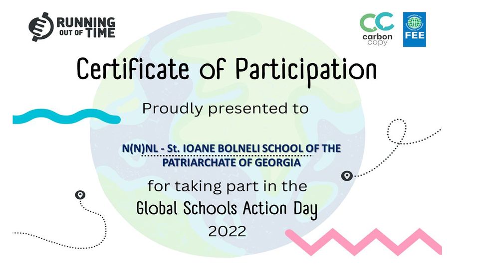 ა(ა) იპ იოანე ბოლნელის სახ.სკოლა სკოლების გლობალური ქმედების დღის აღსანიშნავ ღონისძიებაში აქტიური ჩართულობისათვის საერთაშორისო სერტიფიკატით დაჯილდოვდა